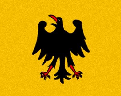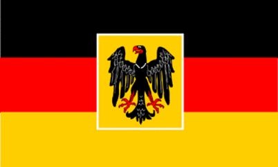 这是神圣罗马帝国皇帝的黑鹰旗帜(Imperator Romanorum Semper Augustus)。注意红色的鹰爪和鹰嘴。整个图案构成了代表德意志民族的黑红黄三基色。近现代德国历史上,经常采用黄地黑鹰的标志,作为其国徽图案。 而德国历史上的萨克森等诸侯国,也用类似的黑鹰图案来作为国徽和王室徽记。其来源,都可以追溯到这面古老的旗帜。奥地利帝国的墨黑-金黄双色国旗,其基色 也来源于此。