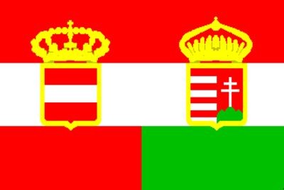 这个时期,奥地利帝国变为奥匈二元帝国,使用过上面这样的拼合旗帜:左侧的红-白-红代表奥地利,以及皇室洛林-哈布斯堡家族,右侧的红-白-绿旗帜和圣伊斯特万王冠、洛林十字,象征古老的匈牙利王室。