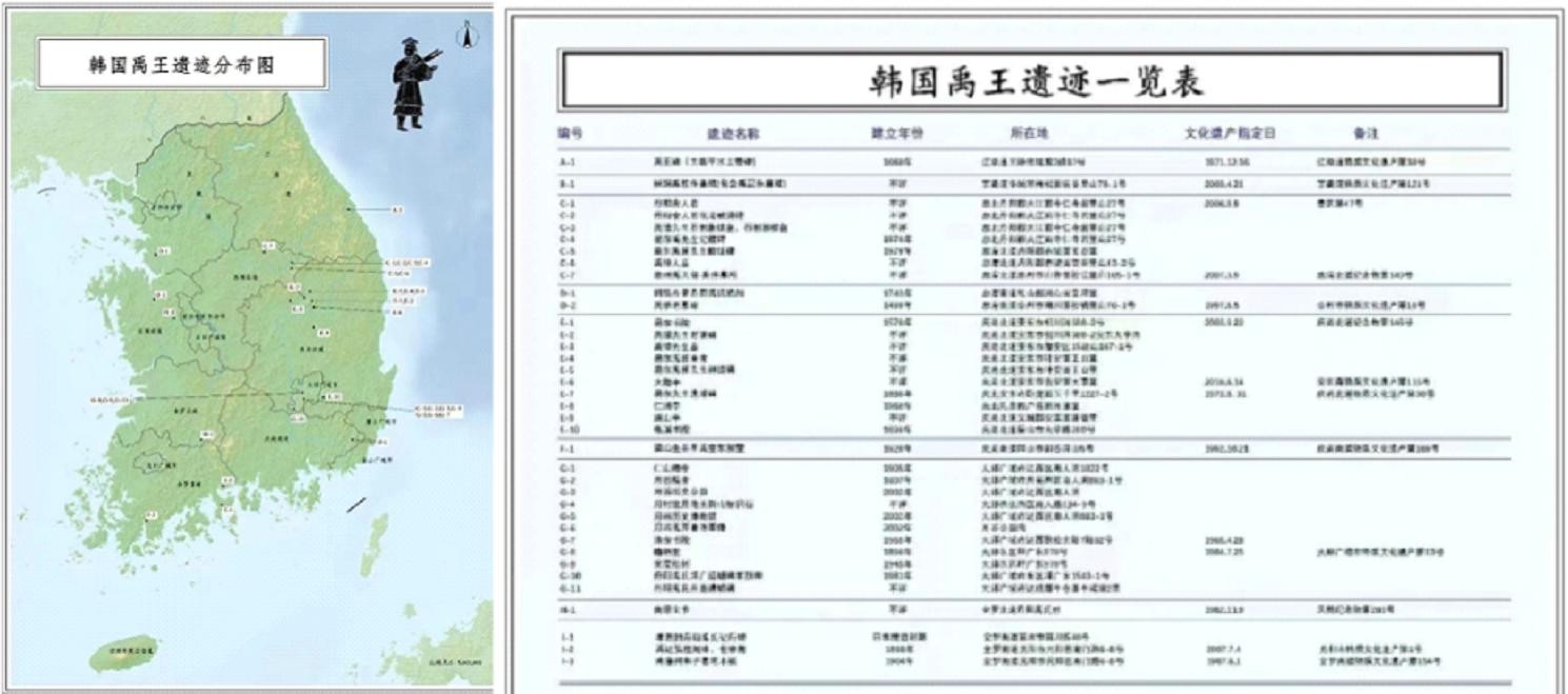 中国禹迹图编委会:《韩国禹王遗迹分布图•一览表》,共计收录韩国禹迹37处。