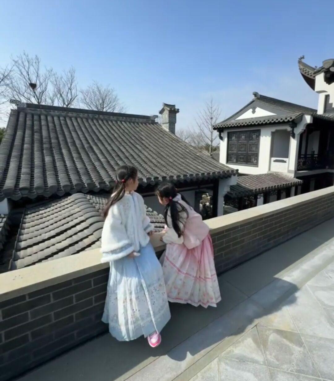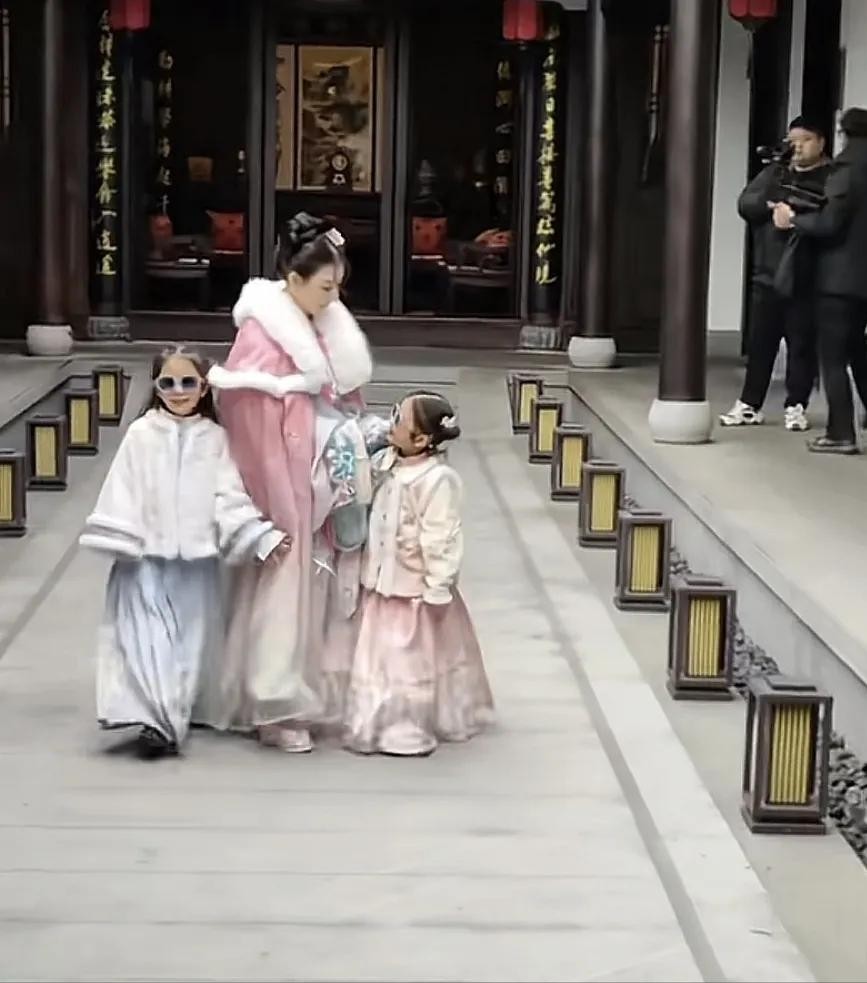 从背景中不难看出,方媛是在某民宿里拍写真。陪伴方媛拍照的还有两个女儿,她们和妈妈一样都换上了古装。
