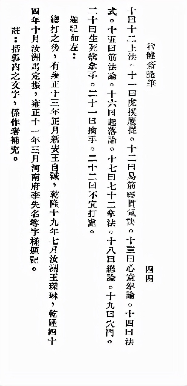 1、上海徐谷鸣老师于台湾出版的《心意六合拳》著作中 “按清雍正十三年正月河南新安人士长礼人氏,进士王自成 男王益恺校”。不知此处的 ‘清雍正十三年正月’,是否依据唐豪先生著作后加。
