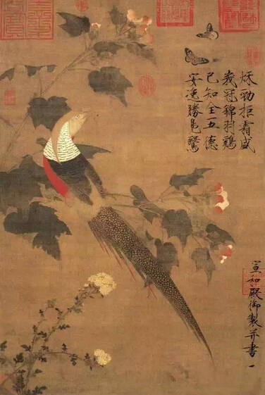 《芙蓉锦鸡图》是中国历代经典名画中的精品,风格殊异、妙笔纷呈。宋徽宗赵佶以其独特的艺术天赋和精湛的绘画技巧,使用笔和设色这两大中国传统绘画技法的元素达到完美的统一,且以特有的笔调活灵活现地传达出所描绘对象的精神特质,达到了高度成熟的艺术化境,使其作品栩栩如生、流传千古。