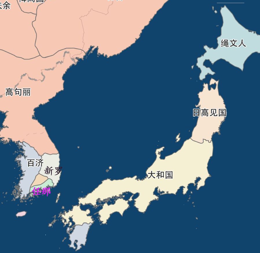 3世纪末,以大和(奈良)为中心的大和国崛起。大和国流行前方后圆的巨大坟墓,这一时期又被称为“古坟时代”。大和国能征善战,逐渐取代了邪马台国的宗主地位。到四世纪末,大和逐渐统一了日本列岛南部地区。刚统一的大和就以大国自居,趁朝鲜半岛混战之际,打着援助百济的旗号,出兵占领了朝鲜半岛南部的任那地区。6世纪中叶,在朝鲜人民的反抗下,大和被迫退出朝鲜半岛。