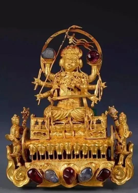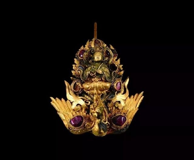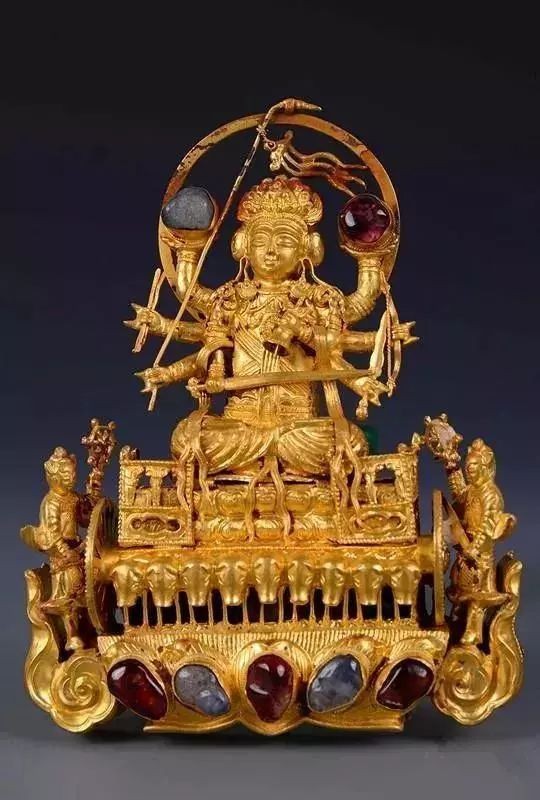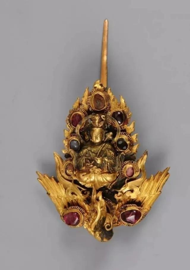 金镶宝石摩利支天挑心,明都昌王朱载塎夫妇墓出土,现于江西博物馆。