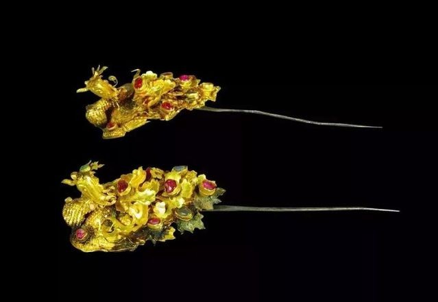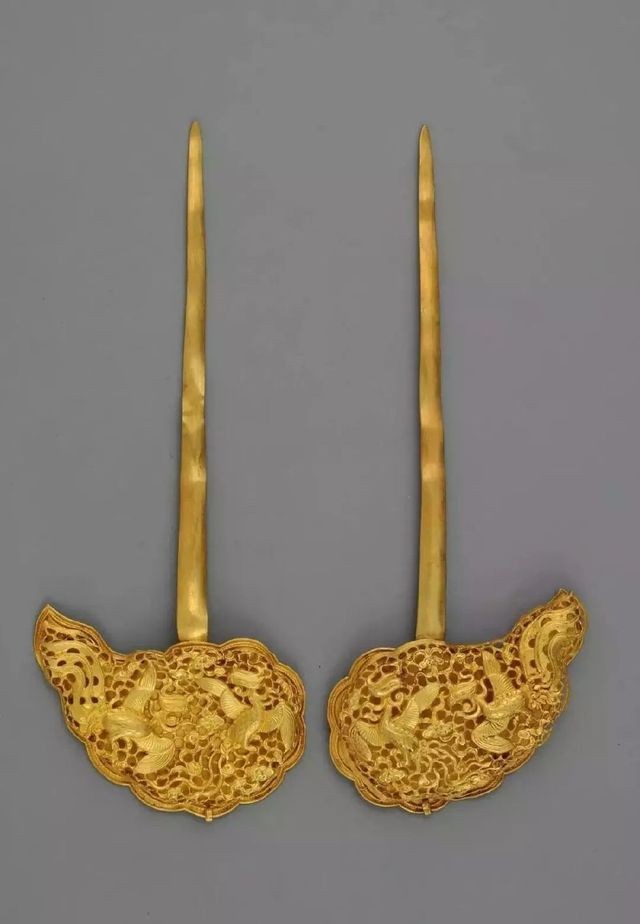 湖北蕲春荆端王次妃刘氏墓出土的金凤冠,现于湖北省博物馆藏,便同时出土的金凤簪一对。