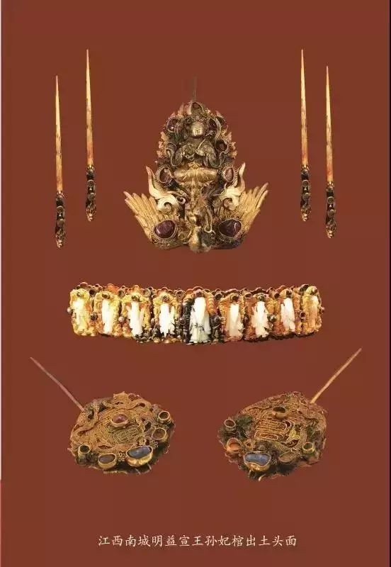江西南城明益宣王孙妃棺中出土的头面有挑心一件,金钿一件,掩鬓一对,福寿簪一对,龙头簪及凤头簪各一对,组成了纹样主题一致的一副头面。