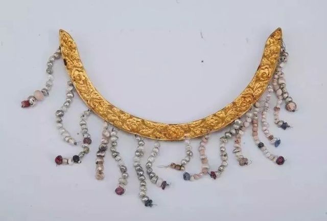 串珠牡丹纹金围髻,江西省南城县益宣王墓孙妃棺出土,现于江西博物馆。