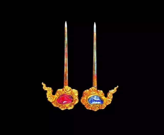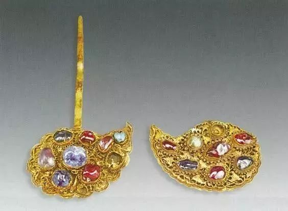 镶宝石云纹头鎏金银掩鬓,江西省南城县益端王墓彭妃棺出土。现于江西博物馆。