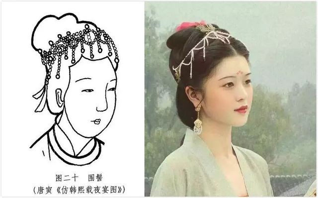 虽然围髻传世较少,不过在明代绘画中很多女性都有佩戴,仇英《汉宫春晓图》及唐寅《吹萧图》、《仿韩熙载夜宴图》中的仕女头上都戴有这种头饰。从画中也能看出,当时女性并没有将围髻与髻固定组合,也可分开佩戴。