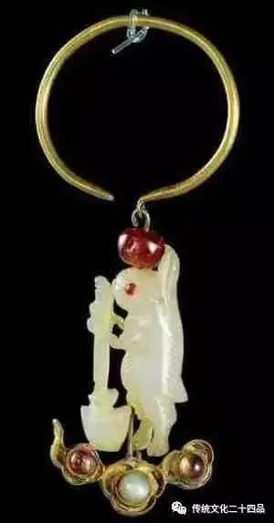 明定陵出土金环镶宝玉兔耳坠。
