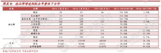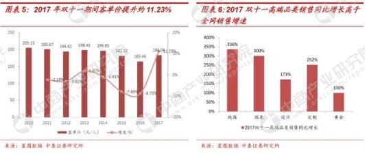 双十一增速超预期,全渠道以及品牌化消费成为促销趋势。2017年双十一电商呈现加速态势,电商总成交额达到2539.7亿元,同口径同比增长43.45%,天猫实现总销售额1682.70亿元,同比增长39.36%,增速较去年环比提升约7.07%,超出市场预期,而京东、苏宁易购增长同样较为优异,新零售元年,全渠道促销成为趋势,天猫、京东、苏宁易购等借助线下门店实现促销、服务以及物流等,提升效率与物流体验,如苏宁易购、茵曼等利用线下门店实现融合促销。平台品牌化消费效应带动客单价的提升,导致销售额整体超预期,而与平台关联度较高,传统品牌增速高于淘品牌增速,品牌化消费的趋势带动客单价提升,客单价相较去年同期提升约11%,消费者消费能力提升。