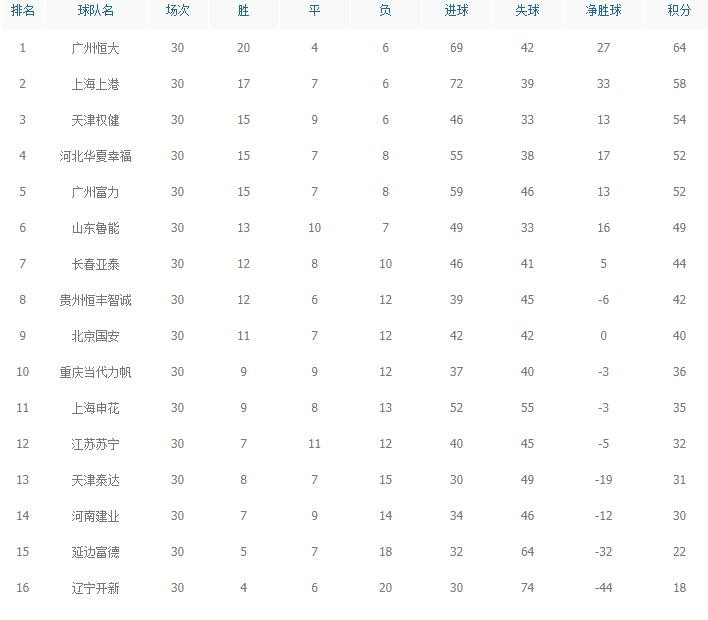 2017中超最终积分榜:恒大64分夺魁,辽足延边降级