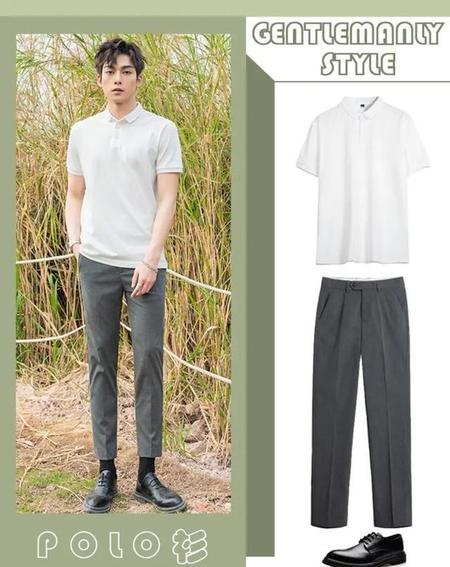 白色poLo衫搭配九分灰色西裤,简约高级感,搭配黑色皮鞋,优雅绅士的型男魅力。