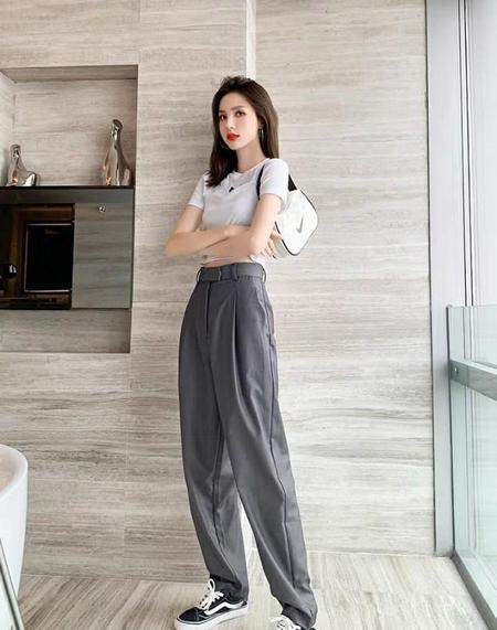 浅灰色裤子一般偏运动类型的多一些,而这些句裤子往往都是高腰宽松的裤子,所以上衣的搭配,一般选择短装显瘦的衣服,这样更加显得腿长,人瘦看着也舒服。深色的裤子一般牛仔裤西裤类型多一些,深色虽然更显瘦,但给人一种厚重感,夏天本就热,再看你一眼这么厚重的服装搭配,就更加热了。