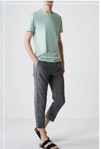 绿色T恤夏日的味道,清凉舒适,搭配九分灰色格子西裤,优雅时尚,搭配凉鞋,简洁帅气。