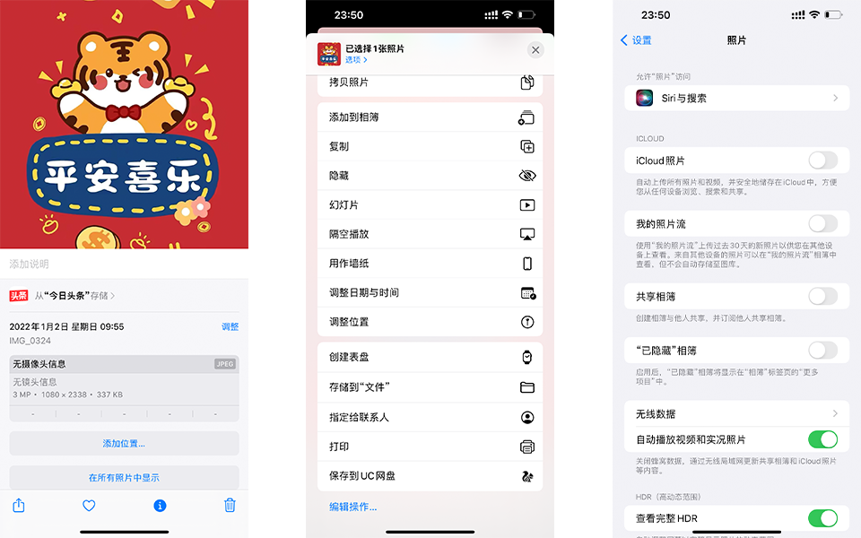 有些时候我们想要知道照片拍摄的具体时间,这个时候只需要查看照片后在上划, 底部就可以出现照片的详细信息了。比如照片来源,拍摄时间,相关拍摄参数等等。