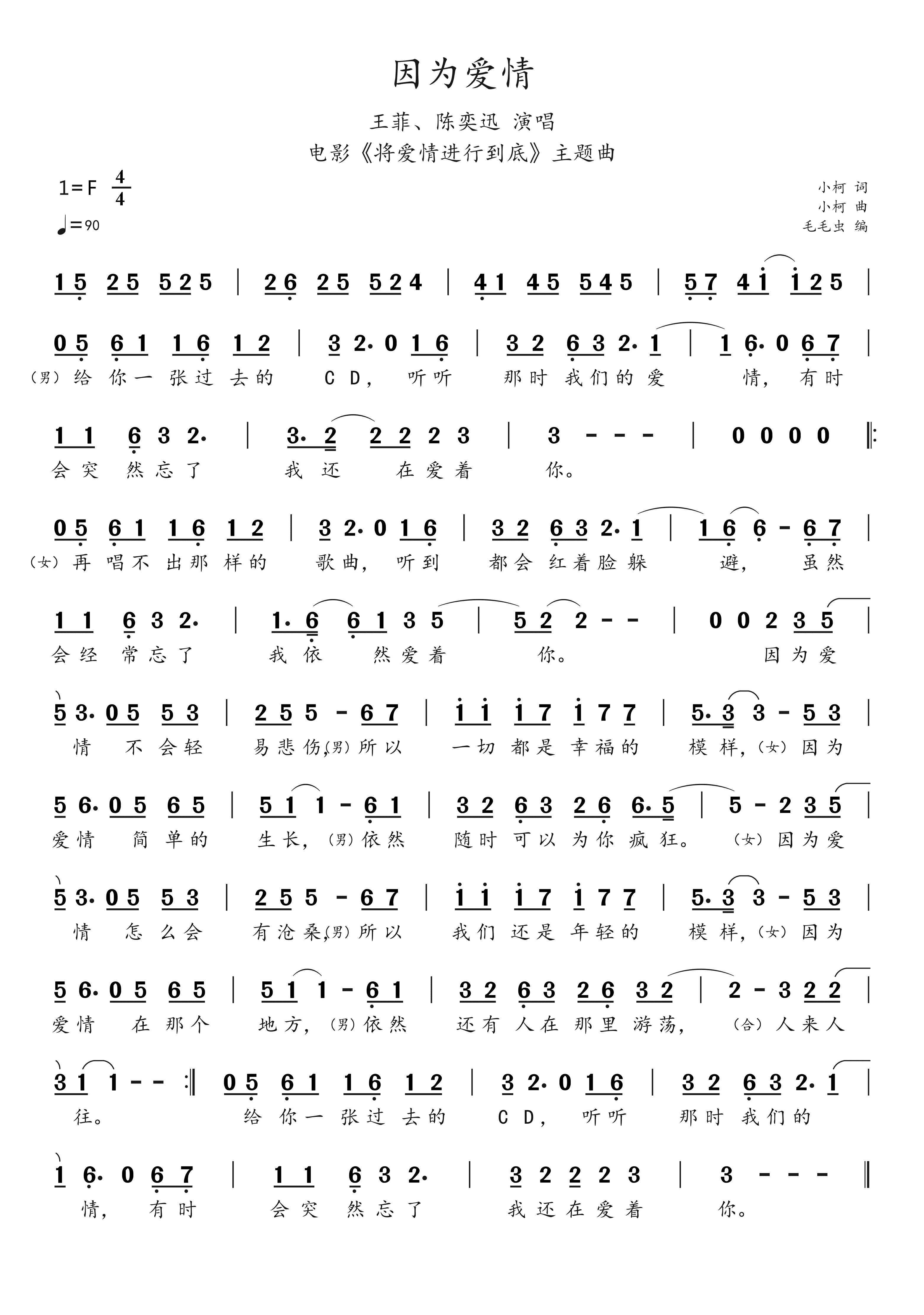 因为爱情歌词(简谱:王菲&陈奕迅《因为爱情》-“将爱情进行到底”主题曲)