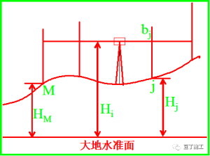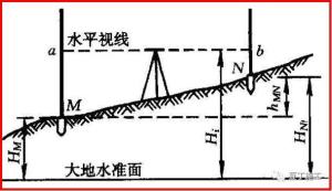 原理:利用水准仪提供的水平视线对竖立在两点之间的水准尺进行观测 ,并通过其中一个点(M点)的高程推算另一个点(N点)的高程。