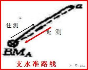 (3)支水准路线:从一水准点出发,沿线测量各待定点,其线路既不闭合到原来的已知点,也不附合到另一已知点。而是通过往返观测来检查观测差。理论上往返高差应为绝对值相等而符号相反。