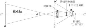 成像原理:目标经过物镜和对光凹透镜的作用,在镜筒内造成倒立求、缩小的实像,通过调节对光凹透镜,就可以使像清晰地成在十字丝平面上。