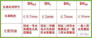 DSn:D表示大地测量S表示水准仪,n为数字表示仪器精度,数值n越小,表示仪器精度越高。如DS0.5,,表示每公里往返测量高差中数的偶然中误差小于或等于0.5mm。