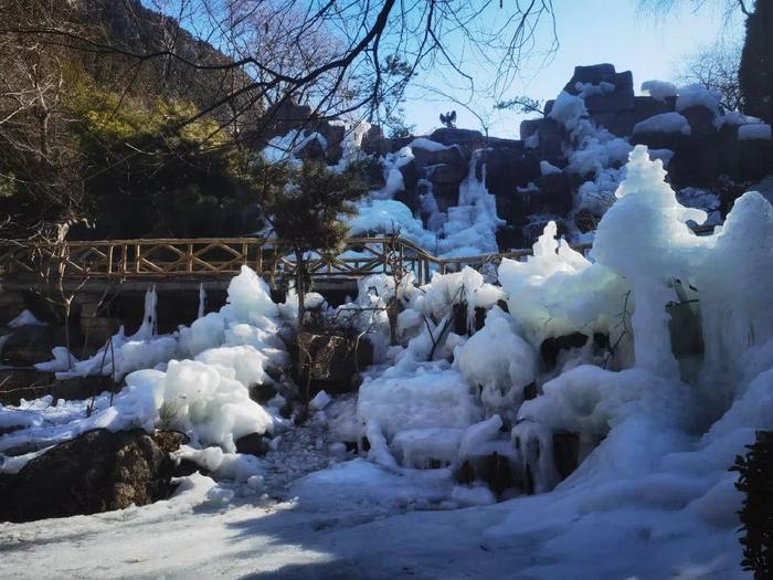 九顶塔旁,观音殿前,有两株高大的千年古柏,相传是由唐朝大将军尉迟敬德亲手栽种的,名曰“茶柏”和“烟柏”,它们像卫士一样站岗守护。“山得水而壮,水得山而媚”,九顶塔的大瀑布一改往日跌宕磅礴的气势,慢慢溅水成冰,在岩石上形成了层层叠叠的冰挂,冰水交融甚是壮观。