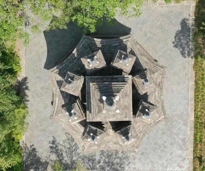 缎华泉北就是九顶塔,建于唐代,是全国重点文物保护单位。九顶塔塔高13.36米,是一座单层砖塔,塔心为实体。八角塔檐的每个角之上各筑三层叠涩挑檐方形小塔,围绕中心同样造型的主塔。平视塔顶,九塔棱角分明,气象森严。从高处俯瞰,九塔如九个花朵,美丽有序,卓然特立。