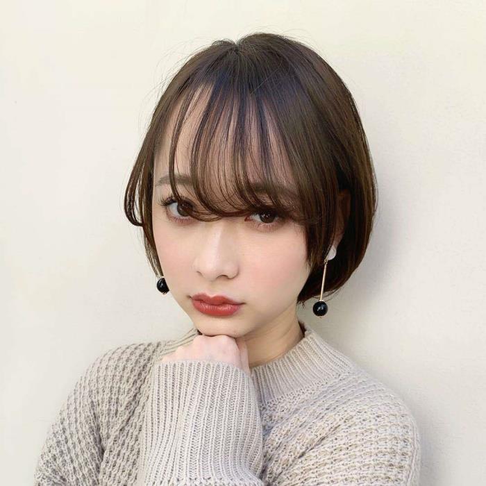 齐斜刘海接近齐刘海,只是在发尾位置向着一个方向倾斜,而且形成偏分的感觉,既有遮盖额头的效果,又有拉长脸型的作用,还能更好的修饰脸型,特别适合额头饱满发际线较高的女生。因为发片分配得比较薄,隐隐约约露出额头,这才是这款刘海的精妙之处。