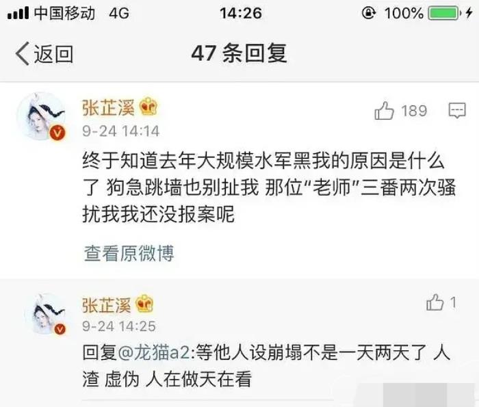 其实,这已经不是张芷溪第一次,在微博正面刚了。