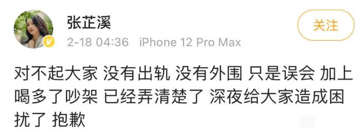 没过多久,张芷溪自己又将爆料的微博删除了,还称只是情侣间吵架,喝了点酒所以才闹成这样。
