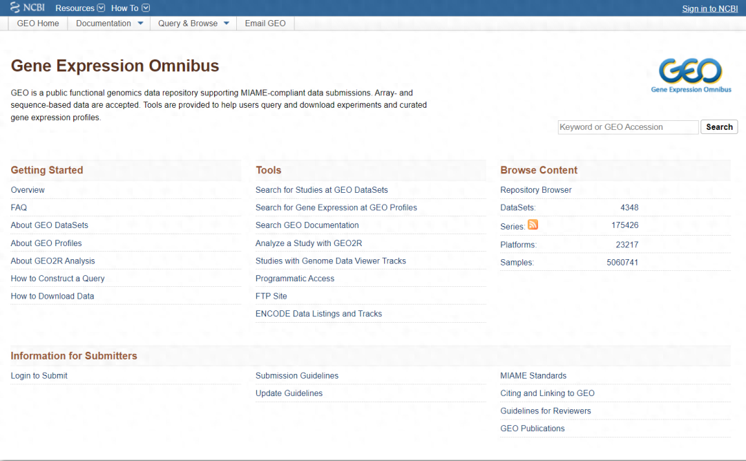 GEO 数据库是一个免费的公共功能基因组学数据存储库,使用简单友好。接受基于阵列和序列的数据,提供的工具可帮助用户查询和下载实验和整理的基因表达谱。