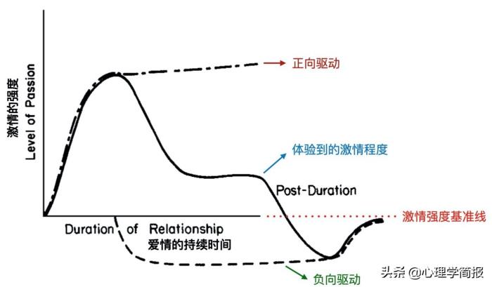 在恋爱关系稳定后,也就是正向驱动稳定和负向驱动增强的状态下,激情的整体水平就会逐渐减低。随着亲密关系的持续时间增加,双方体验到的激情会持续降低直到恢复到基准线[3]。