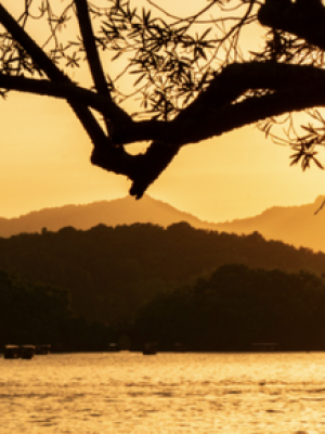 夕阳依然瑰丽绚烂,光辉中,胜湖波光鳞鳞,常有鱼儿跃出水面,一个漂亮的转身,在空中完成造型后,又自由地扎入水中。总有小船及船上的人在不同的水面展示着美丽的剪影,或小心翼翼收网,或转身扬臂撒网,或悠然地在湖中荡漾。倒是几处有芦苇的地方,眼见得有成双对的鱼儿出没,却没人理会。偶见临岸的水面有一群女孩子头顶蓝底白碎花的毛巾,坐在木桶中,双手上下翻飞,在采摘菱角,笑声不断,在飞快而敏锐的找寻中,我并未见到林的影子,但我的经过,分明扰了她们在什么,什么的鱼,笑声在经过短暂的停顿后,又自由自在的爽朗起来,想必,我的白色的确凉的衬衣印满了她们新鲜欲滴的目光。