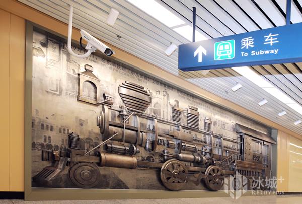 位于地铁车站墙面上的《轮·回》艺术品,以中东铁路时期第一辆火车头(编号205),和新中国成立后第一代“毛泽东号”火车头的造型为设计元素进行创作,背板图像则呈现了哈尔滨火车站四次站房改造工程的珍贵图片与文字资料;车辆上斑驳的痕迹犹如一部凝固的城市时间简史,承载了一座城市的百年记忆。