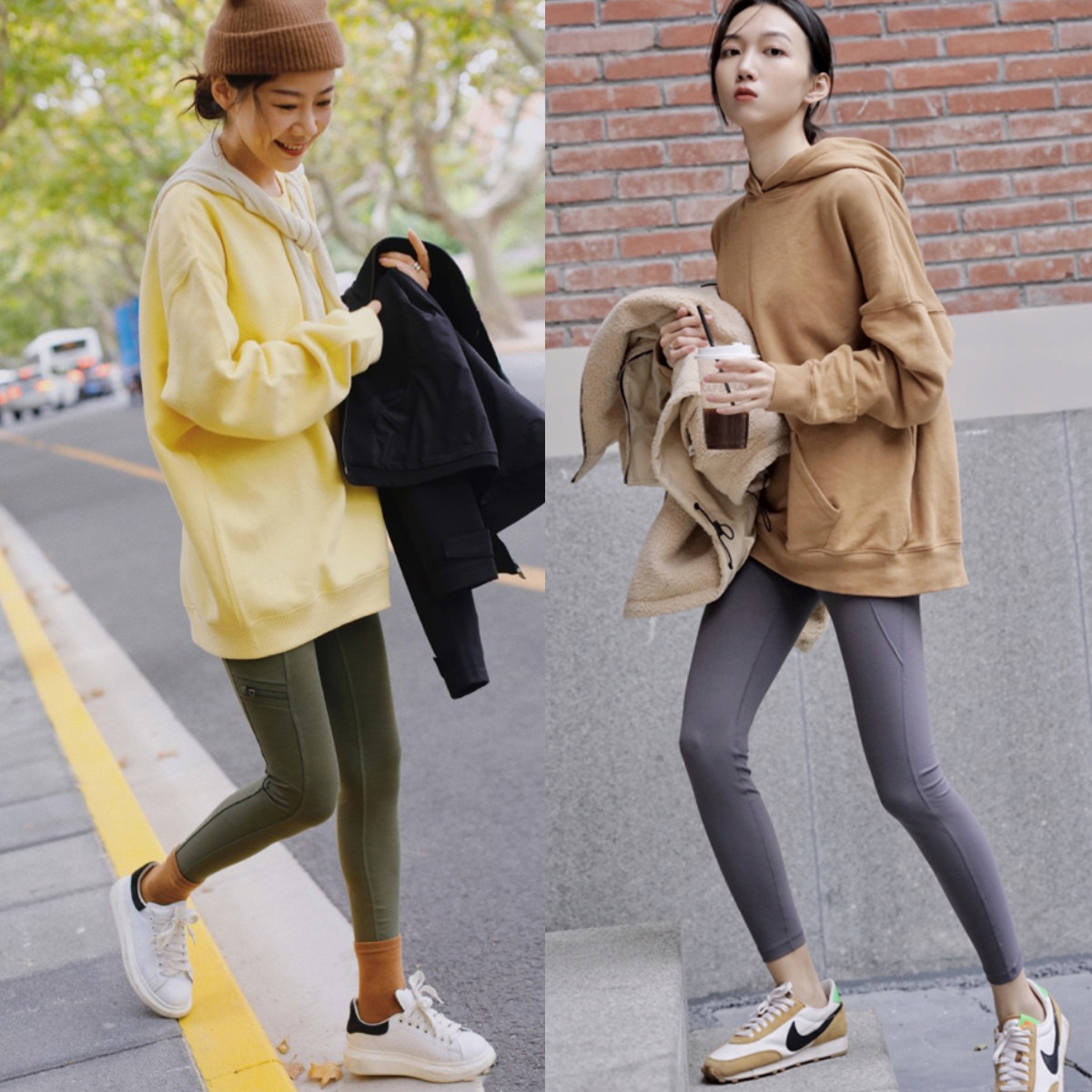 卫衣的版型宽松,且带有一定的减龄感,和瑜伽裤搭配在一起,不仅能削弱瑜伽裤的呆板、老气,还能打造出“上松下紧”的反差,显瘦又显腿细。