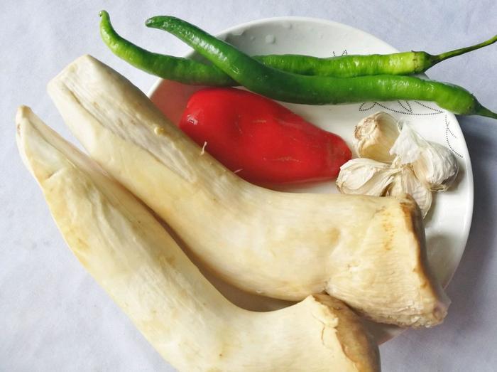 【烹饪食材】:杏鲍菇300克,青椒两根,大红椒半个,大蒜适量。