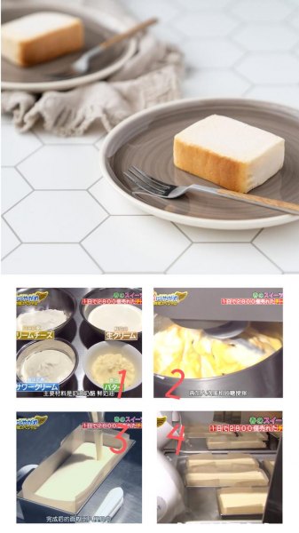 1,基础原料用了奶油奶酪,鲜奶油,酸味奶油和黄油,搅合加入鸡蛋和牛奶,做成最基本的蛋糕液。