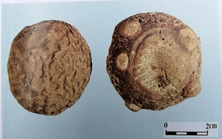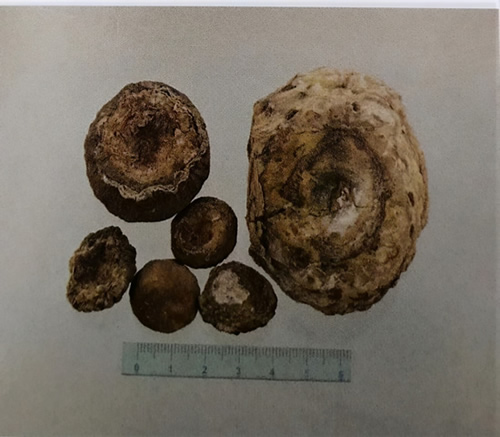 经验鉴别:本品呈扁平类圆球状。直径3~5cm。表面棕色,光滑。顶端茎痕平坦,根痕较粗。茎痕周围有多数突起的球状侧芽,质坚硬。
