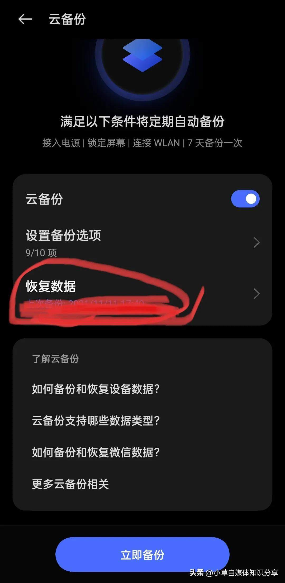 我们想要恢复时,在备份界面点击【恢复数据】。在恢复数据的页面,点击【当前设备】,找到云备份详情,往下滑,找到微信,点击【立即恢复】,就开始恢复你想要的一切记录了。