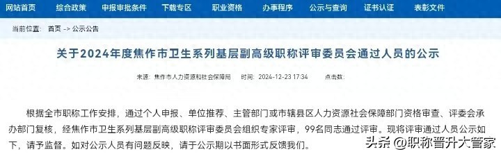 焦作市2024年度卫生系列基层副高级职称评审通过人员公示