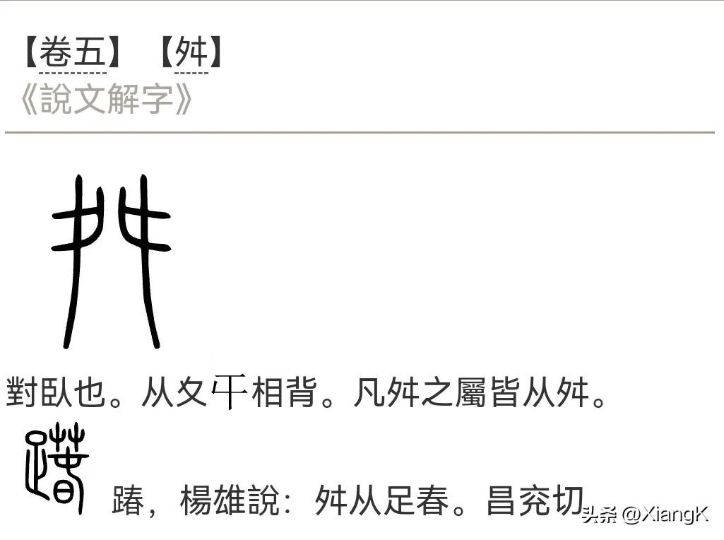 ①「说文解字」中: 對臥也。从夊 相背。凡舛之屬皆从舛。「“谓人与人相对而休也,相背,犹相对也。”」