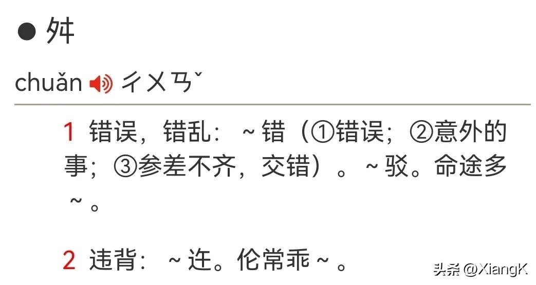 (1)、错误,错乱:舛错(①错误;②意外的事;③参差不齐,交错)。舛驳。命途多舛。
