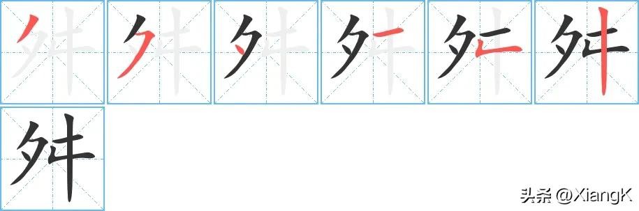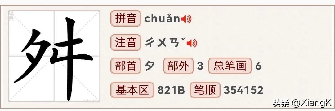 读音为“chuǎn”、同音字“喘”、部首为夕、总笔画6、左右结构。