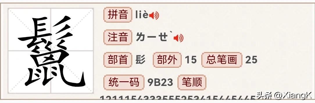 读音为“liè”,同音字“列”,部首为“髟”,总笔画25,上下结构。