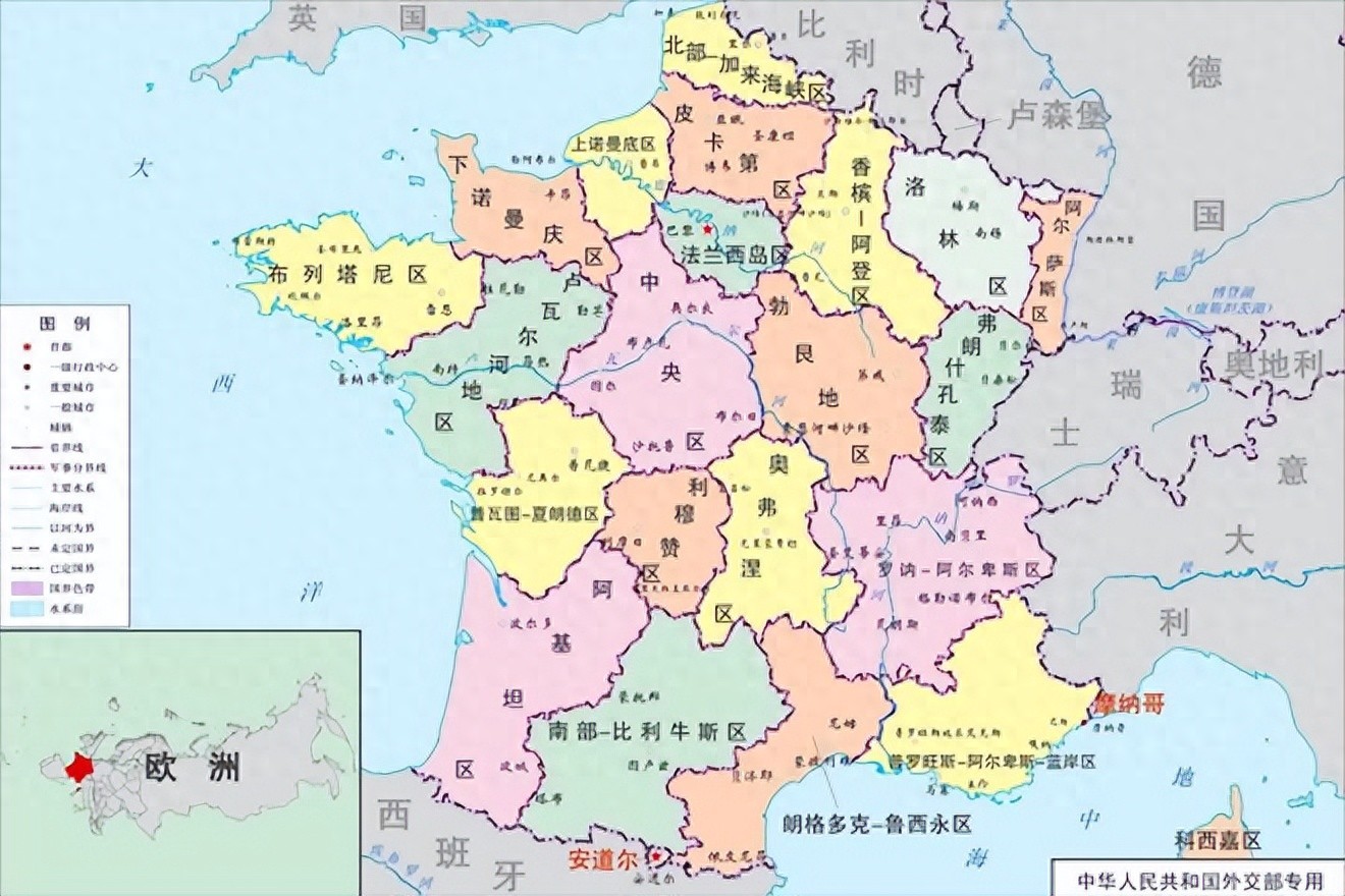 法兰西共和国,简称法国,首都巴黎,位于欧洲西部,总面积55万平方公里,本土划为13个大区、94个省。