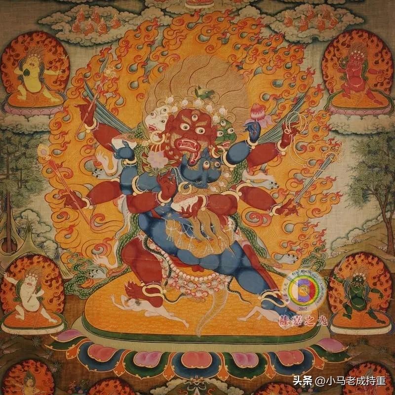 3、供奉的佛像不一样,显宗供奉的是慈祥的佛像,也就是和我们在汉地寺院看到的佛像一样的,叫静寂像。而密宗供奉的佛像有些十分恐怖,牛马,马面,狮子头,人血、骷髅项链等。。。。。这些不是妖怪,是明王或者叫忿怒像,也是佛或者菩萨化身而来,用来降妖除魔,或者消除修练者内心的业障。密宗佛像还有很多双身佛,或者叫欢喜佛,与佛相拥的女人叫明妃或者叫佛母。