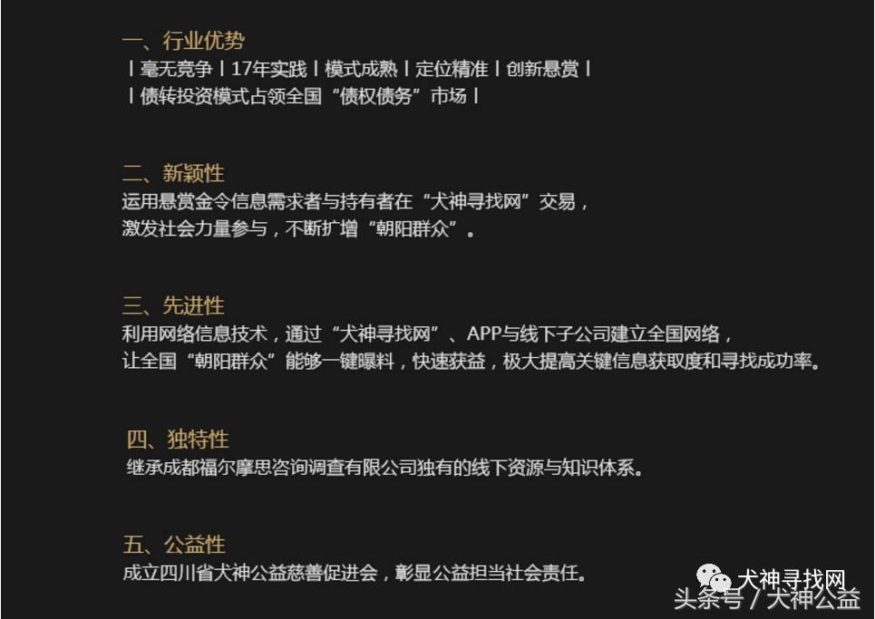 人人投股权众筹网络服务平台的出现是对民间投资路径的有益探索。线上“犬神寻找网”利用互联网的科技创新及放大的社会关系网,结合线下17年的侦探调查取证经验,诚信、专业、高效解决债权债务问题,决心向全社会不诚信行为宣战。“悬赏寻老赖·犬神寻找网”--一个面向全中国专业解决债权债务的项目于2017年4月6号登录人人投。在犬神战略升级之际,出让10﹪的股份,并通过人人投的平台进行股东招募,首次投资额外赠送股份,欢迎人人投会员加入。同时让全民参与社会诚信构建,依托互联网平台,弥合信息鸿沟,让天下没有难办的事。