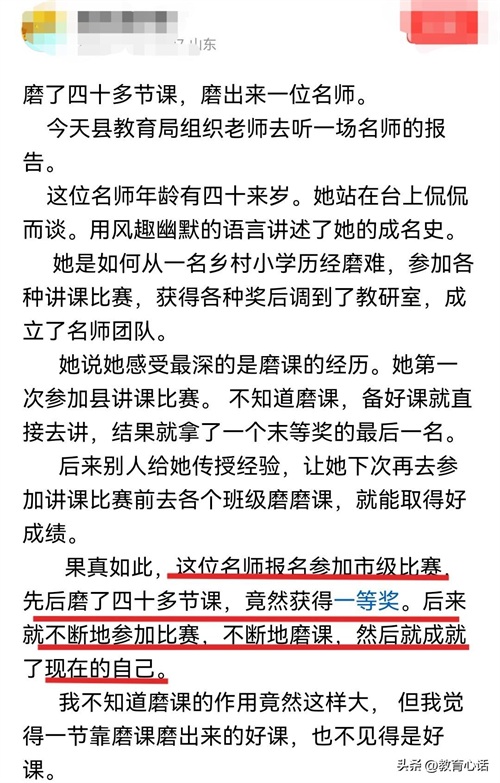 不过,近年来出现了一批靠磨课磨出来的名师。这些所谓的名师,通过不断的磨课,甚至有人一堂课前前后后磨了40多次,从而让自己在比赛中获得更好的名次。获奖次数多了,这些老师就被包装成了名师,成了学校的招牌。对于这些所谓的“名师”而言,他们取得了令人瞩目的成就,可以说是名利双收。但实际上,他们成功的背后却隐藏着很多问题。