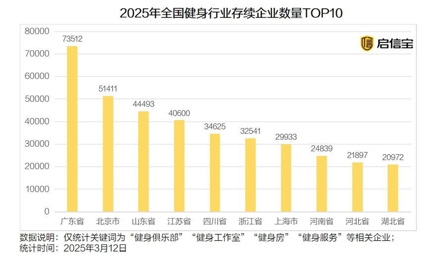 从地域分布上看,健身企业主要集中在经济发达或人口密集区。数据显示,2025年广东省健身相关存续企业数量达到7.35万家,位居全国首位。北京市、山东省分别位列第二、第三位,存续企业数量分别为5.14万家、4.44万家。广东省不仅在健身企业数量上领先,更是公认的“运动大省”,公开数据显示广东省2020年体育产业总规模达到5149.94亿元,预计到2025年这一数字将突破9000亿元。此外,今年备受瞩目的第十五届全国运动会也将由广东、香港、澳门三地共同举办,这也将进一步推动该地区体育产业的发展和全民健身热情的提升。