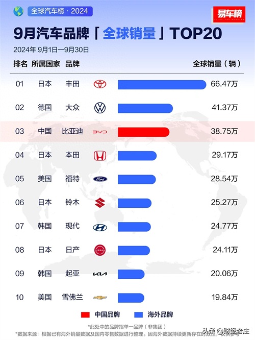 小结:9月全球汽车品牌销量排行,丰田遥遥领先,大众第2,比亚迪第3。